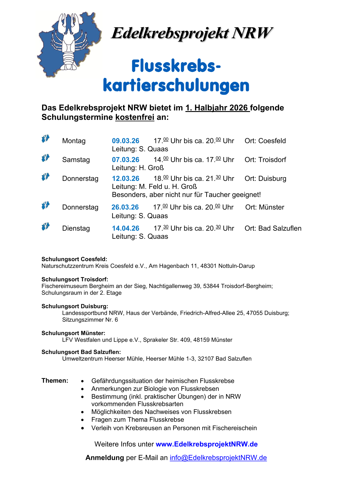 Anmeldungen via E-Mail an: info@edelkrebsprojektnrw.de