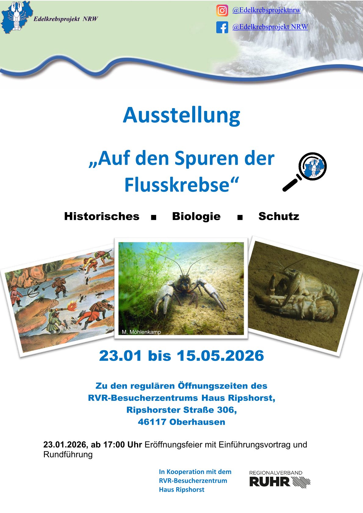 Am 23. Januar 2026 eröffnen wir im RVR-Besucherzentrum Haus Ripshorst unsere neue Ausstellung "Auf den Spuren der Flusskrebse".